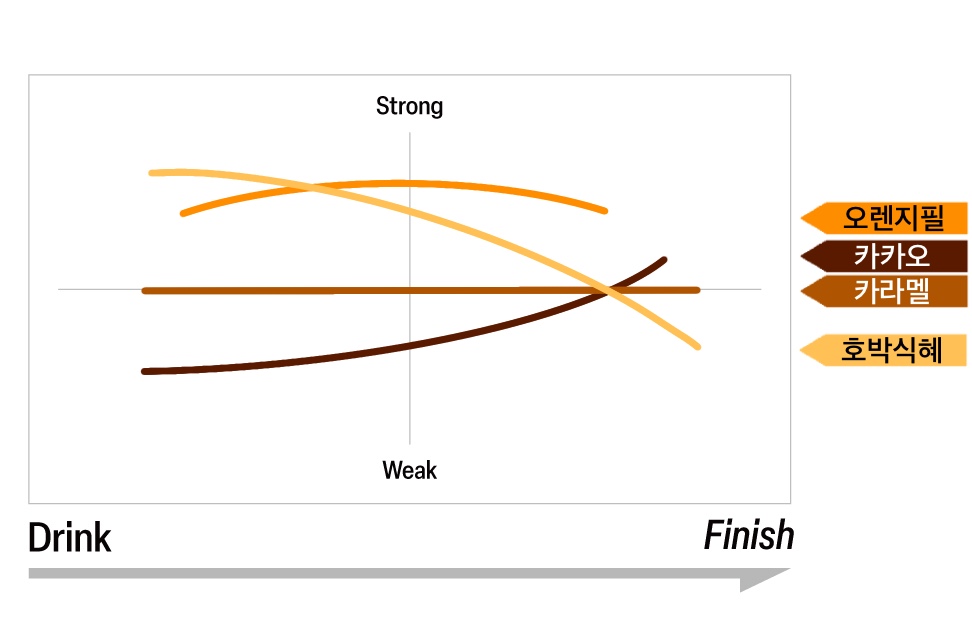 호박식혜와 카라멜이 만들어내는 부드럽고 은은한 단맛으로 첫인상을 시작합니다. 이어서 오렌지필 특유의 산뜻한 시트러스 산미가 더해져 활력을 주며, 피니시에서는 카카오의 고소하면서도 쌉싸름한 여운이 남아 전체적인 구조를 깔끔하게 정리합니다.